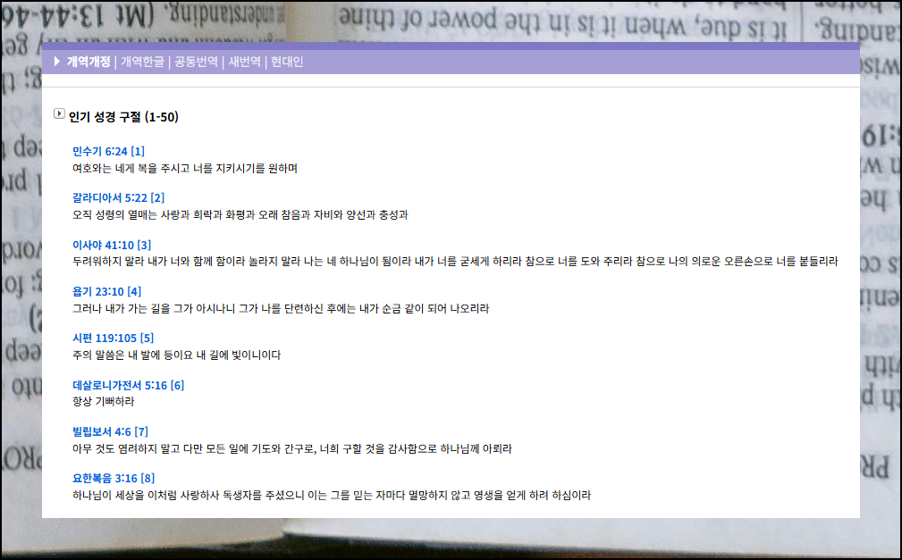 단순한 텍스트 파일에서는 체험할 수 없는 특별한 기능들이 많이 준비되어 있어요. 많은 사람들이 좋아하는 구절만 골라서 볼 수 있고, 매일 규칙적으로 읽기 습관을 만들어주는 도구도 제공합니다. 인기 구절 순위를 1위부터 50위까지 확인할 수 있어요.