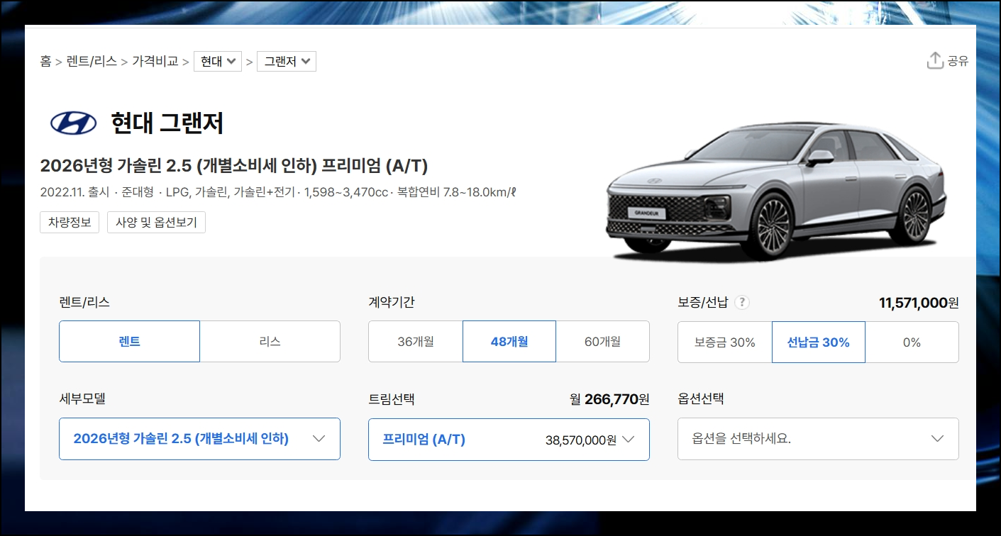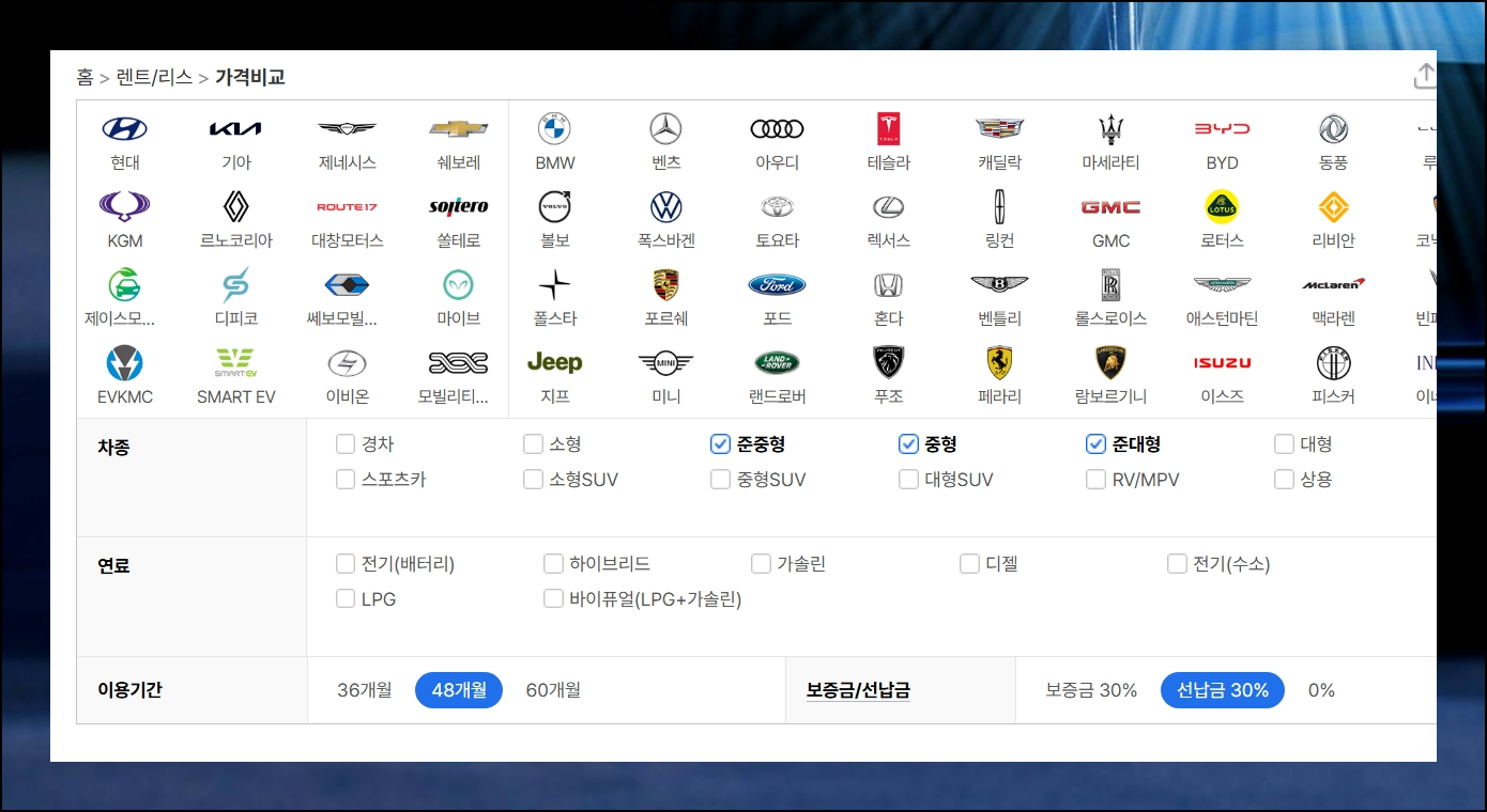 원하는 차량을 선택하면 임대기간과 보증금을 더 구체적으로 설정할 수 있어요. 세부 모델을 변경하면 비용도 함께 달라지니 예산에 맞춰 조절하면 됩니다. 실시간 견적 시스템으로 변경 사항이 바로 반영되는 것을 확인할 수 있죠.
