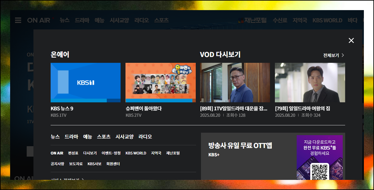 공영방송의 공식 사이트에 들어가면 특별한 준비 과정 없이 바로 시청을 시작할 수 있어요. 계정 생성이나 접속 절차 같은 복잡한 단계는 생략할 수 있습니다. 생방송을 원한다면 ON AIR 버튼을 누르면 되고, 이전 방송을 보려면 무료 tv 다시보기 버튼을 클릭하면 됩니다. 사이트 왼쪽 상단의 메뉴를 클릭하면 두 가지 버튼이 나타날 거에요.