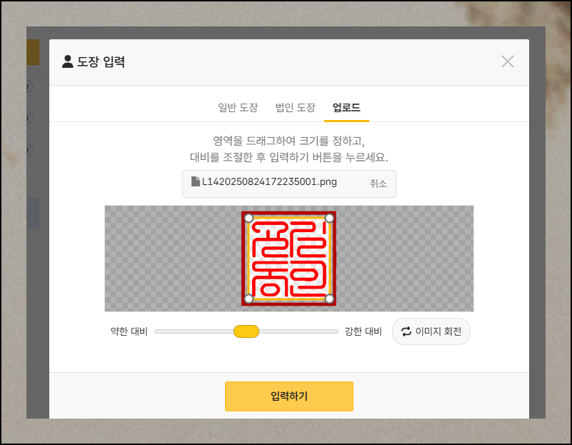 업로드 페이지에서 [파일 업로드] 옵션을 클릭해서 저장된 인감도장 이미지를 선택하세요. 파일이 올라가면 자동으로 명암 조절이 되면서 배경이 투명하게 변환되어요. 변환된 이미지의 품질을 확인하고 [입력하기] 버튼을 누르면 됩니다.