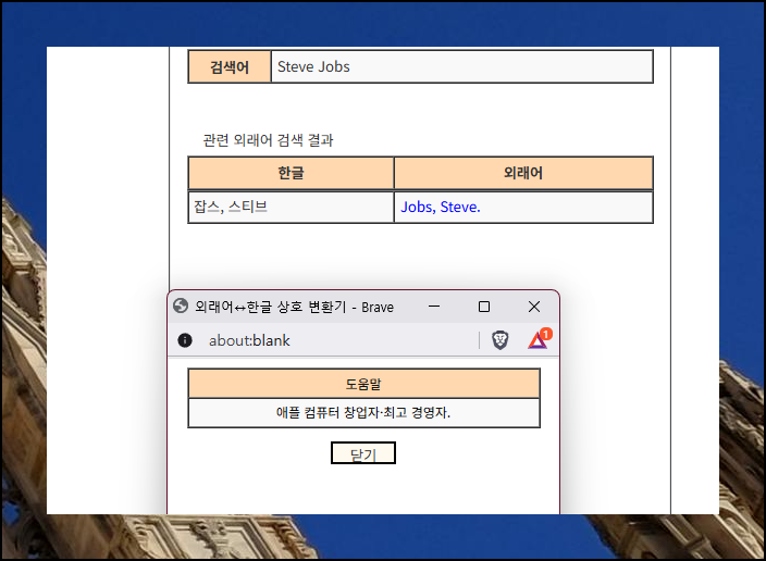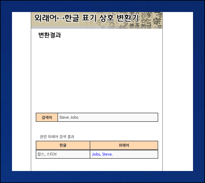 스티브 잡스와 같이 많은 사람들이 알 수 있는 영문이름을 넣어보았어요. 한글로 바뀐 결과가 즉석에서 화면에 드러납니다. 본래 발음과 가장 비슷한 우리글 표현을 신속하게 보여주니까 꽤나 자연스러워요.