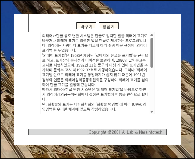 부산대 인공지능연구실과 나라인포테크가 협력해서 만든 시스템입니다. 작동 방식은 놀랍도록 단순해요. 원하는 영문이름을 텍스트 박스에 타이핑하고 바꾸기 버튼만 클릭하면 끝이에요. 반드시 인명 카테고리를 체크해야 합니다. 필요하다면 지역명이나 화학용어 등의 다른 분야도 선택할 수 있어요.