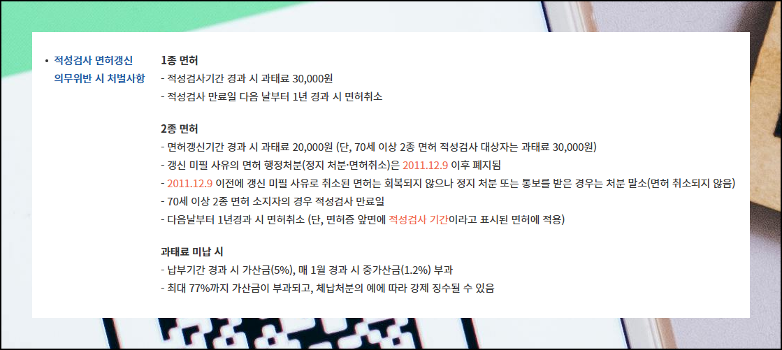 적성검사를 놓쳐야 하는 기한을 넘기면 3만원의 과태료가 부과돼요. 더욱 심각한 것은 만료일부터 1년이 지나면 면허 자체가 취소된다는 점이에요. 일상적으로 차량을 운전하시는 분들이라면 이런 상황이 발생하지 않도록 미리미리 주의를 기울이셔야 합니다.
