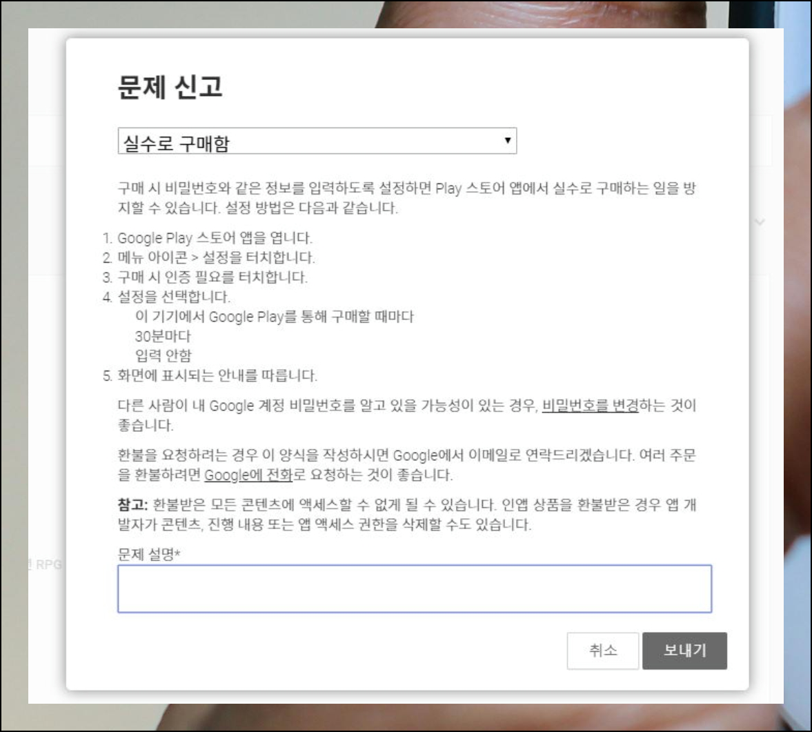 의도치 않은 구매를 사유로 선택했다고 가정해보겠어요. 구글스토어 화면에는 향후 실수 구매를 막을 수 있는 설정 방법이 제시됩니다. 하단의 문제 설명란에는 환불을 요청하는 구체적인 이유를 기재하면 돼요. 대상이 한 개가 아니라 다수인 경우에는 플레이스토어 고객센터에 직접 연락하는 방법이 더 효과적입니다.