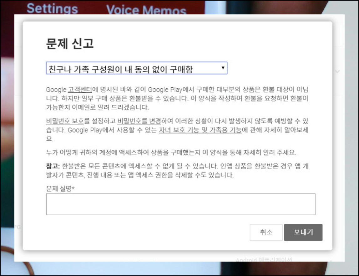 의도치 않은 구매를 사유로 선택했다고 가정해보겠어요. 구글스토어 화면에는 향후 실수 구매를 막을 수 있는 설정 방법이 제시됩니다. 하단의 문제 설명란에는 환불을 요청하는 구체적인 이유를 기재하면 돼요. 대상이 한 개가 아니라 다수인 경우에는 플레이스토어 고객센터에 직접 연락하는 방법이 더 효과적입니다.
