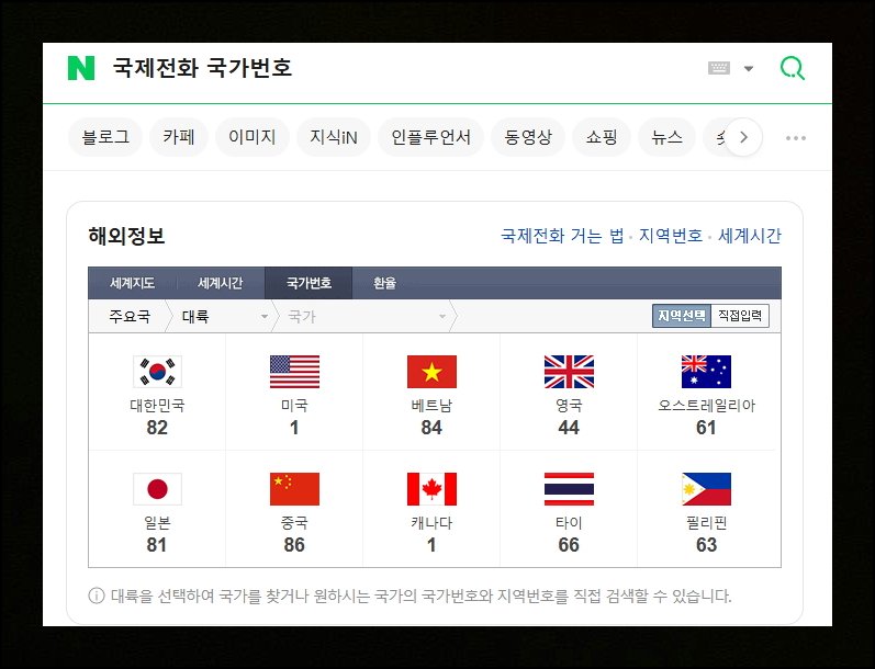 해외로 전화를 걸려면 상대방 전화번호는 물론이고, 국가별 고유번호를 먼저 파악해야 해요. 네이버 검색창에 "국제전화 국가번호"를 입력하면 모든 나라의 코드를 쉽게 찾을 수 있습니다. 베트남의 경우 84번을 사용해요. 우리나라는 82번이고요. 미국은 1번으로 연결할 수 있어요. 유럽의 영국은 44번, 오세아니아의 호주는 61번 식별코드를 씁니다.