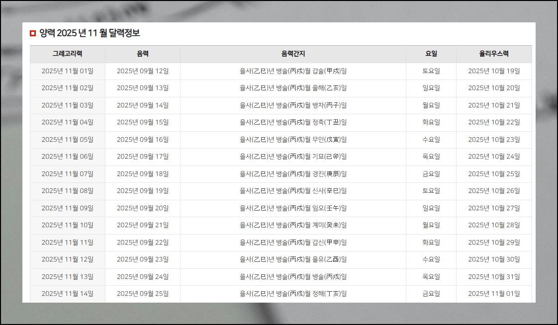 변환기 페이지 좌측 상단을 주목해보세요. 월별 음양력이라는 메뉴가 보일 거예요. 이 항목을 선택해보시면 됩니다. 확인하고 싶은 연도와 월을 각각 입력하는 칸이 나타나요. 그러면 그달 전체의 정보를 한 번에 볼 수 있습니다. 음력 날짜와 양력 날짜를 나란히 비교하며 확인하고 싶을 때 아주 좋은 기능이에요.