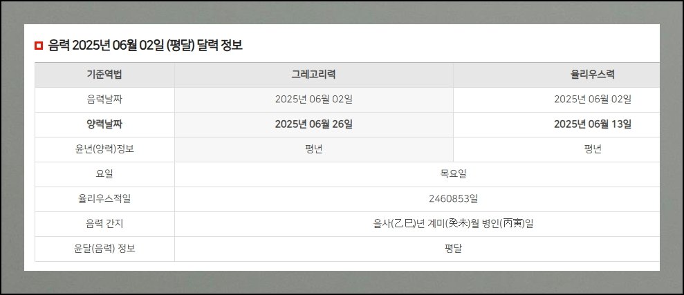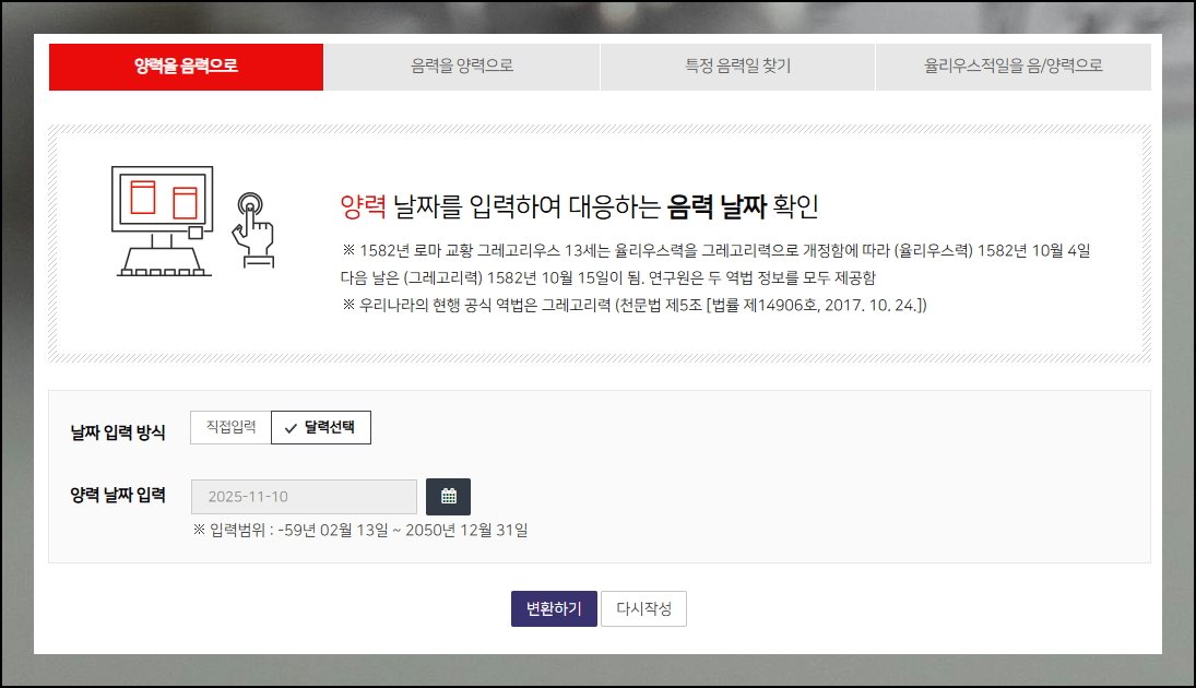 날짜를 바꾸는 과정은 생각보다 훨씬 간단해요. 변환하고 싶은 날짜를 입력란에 적어넣으세요. 입력을 마쳤다면 검색 버튼을 클릭하면 됩니다. 화면에 즉시 결과가 표시되는데요. 단순히 변환된 날짜만 알려주는 게 아니에요. 율리우스력 기준 계산값도 제공됩니다. 그해가 윤년인지 아닌지도 확인할 수 있고, 윤달 발생 여부 같은 세부 정보까지 함께 볼 수 있어 더욱 유익합니다.