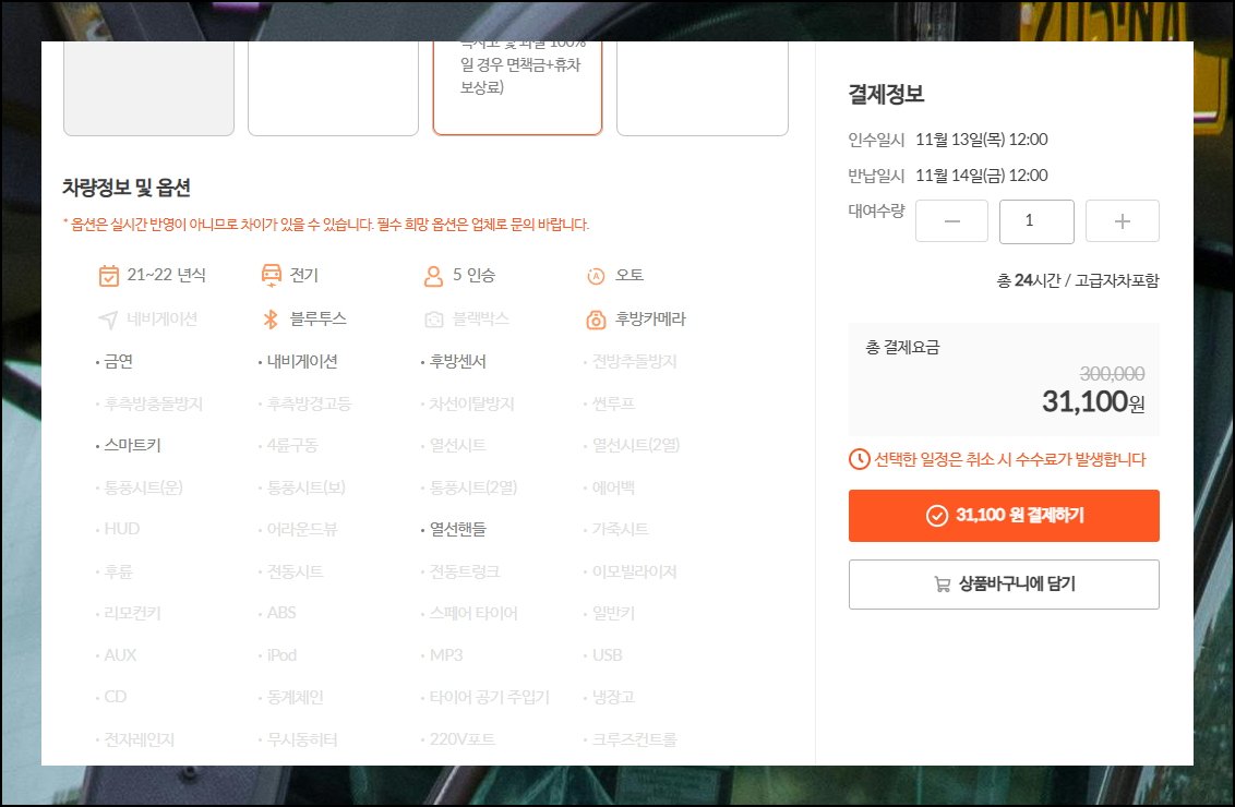 마음에 드는 상품을 클릭하면 상세 페이지로 연결됩니다. 대여 요금표는 물론이고 각종 조건과 꼭 알아둬야 할 주의사항까지 한 화면에 정리되어 있어요. 특히 취소 규정은 반드시 체크해야 하는 항목입니다.