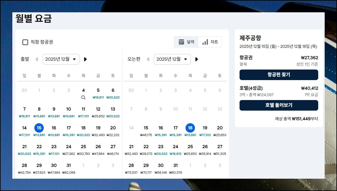 처음 접하시는 분들은 사용 방법이 궁금하실 거예요. 제주는 거리가 가깝기 때문에 직항으로만 설정하면 돼요. 목적지는 제주공항으로 지정해 주세요. 날짜 선택이 가장 중요한 포인트인데요. 한 달 전체 기간으로 설정하는 게 핵심입니다. 그래야 가장 저렴한 항공권을 발견할 수 있거든요.