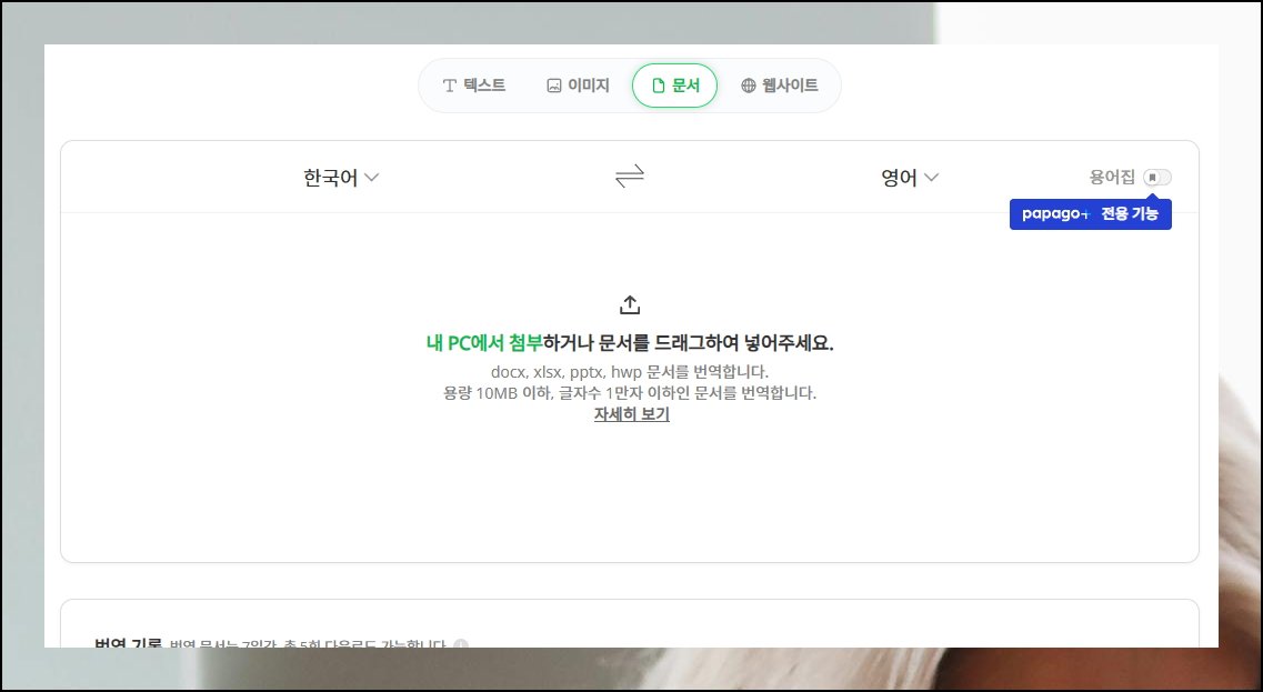 한 달에 10개 문서까지 무료로 이용할 수 있어요. 영어 번역기 서비스에 로그인하면 바로 이 편리한 기능을 쓸 수 있죠. 원문과 변환된 내용을 동시에 화면에 띄워놓고 비교하면서 확인할 수 있어요.