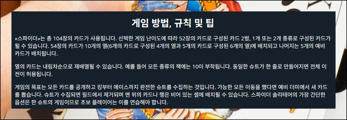 스파이더 카드게임를 시작하기 앞서 진행 방식을 먼저 훑어보길 권합니다. 오랜만에 다시 하는 경우라면 잊고 있던 부분이 분명 있을 거예요. 규칙을 알고 들어가면 게임이 훨씬 재미있어집니다.