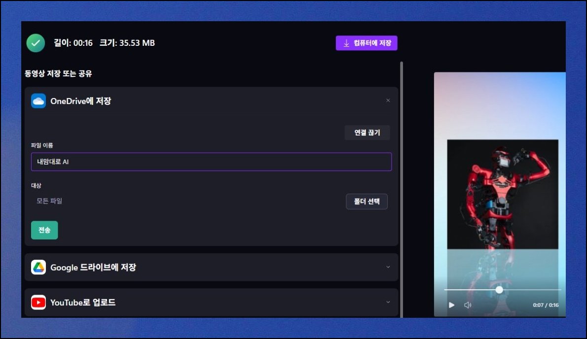 끝으로 BGM과 서체를 세팅하는 과정이 남아 있어요. 목록에 있는 오디오 트랙은 전부 라이선스 걱정 없이 쓸 수 있습니다. 폰트 선택지도 넉넉하니 눈에 드는 것을 골라 보세요. 모든 옵션을 확정한 뒤 내보내기를 실행하면 동영상 제작 완료 창이 뜹니다. 거기서 곧바로 미리보기를 하거나 원하는 경로로 파일을 옮길 수 있어요. AI 덕분에 누구나 손쉽게 영상 제작을 시작할 수 있는 시대가 열린 셈이에요.