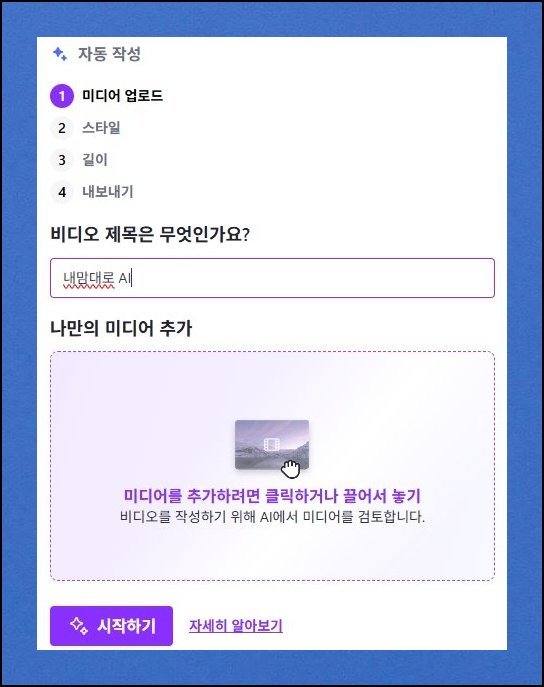 앱을 구동하면 메인 화면이 모습을 드러내요. 이곳에서 수동 편집 모드와 AI를 활용한 동영상 자동 생성 모드 중 하나를 고를 수 있습니다. AI 제작이 목표이니 후자를 찍어야겠죠. 전자는 장면을 직접 다듬는 방식이고, 후자는 대부분의 공정을 AI가 맡아 처리해 줍니다.