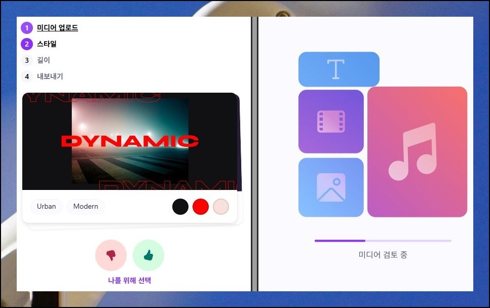 이어지는 화면에서는 동영상 톤을 결정해야 해요. 우아한 무드부터 깔끔한 느낌까지 폭넓은 옵션이 나열됩니다. 각 후보를 훑어보며 마음에 들면 긍정, 아니면 부정 표시를 남겨 주세요. AI 엔진이 그 반응 데이터를 종합해 맞춤형 결과물을 빚어 줄 거예요.