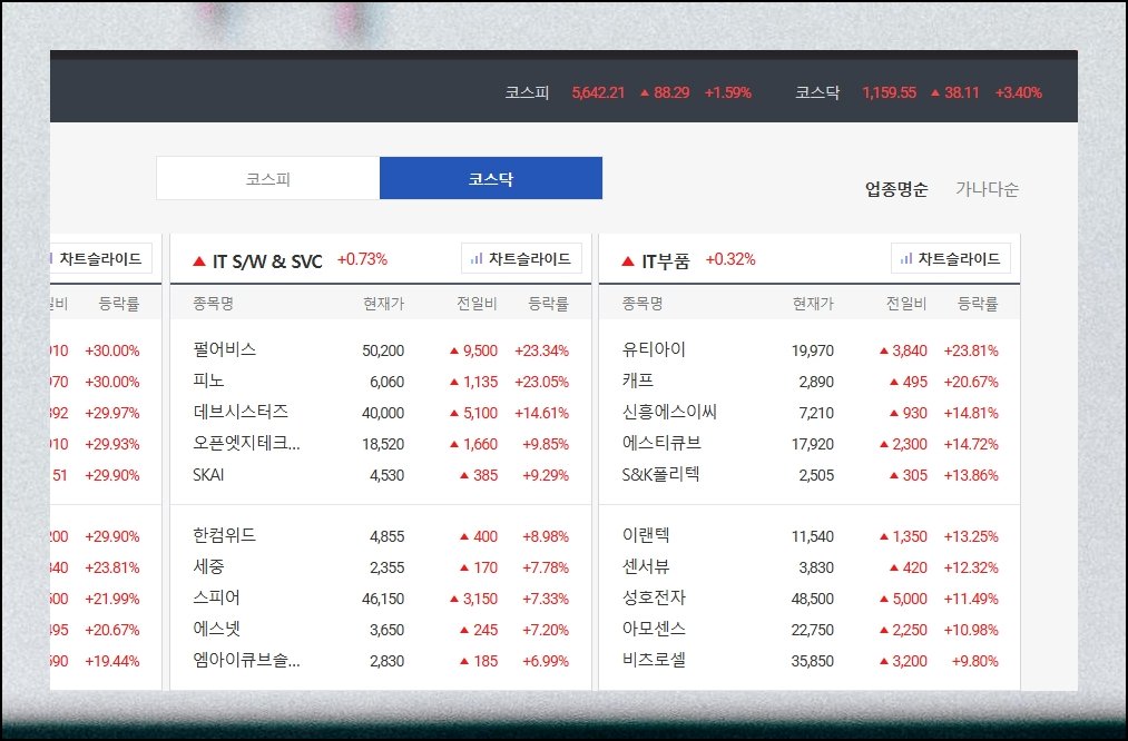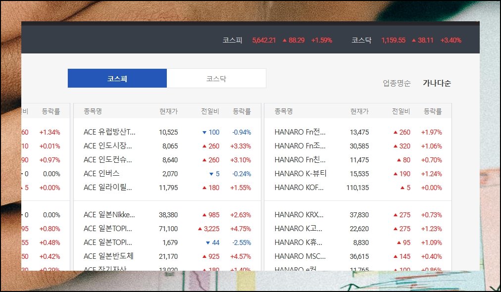 증권사 객장을 찾아가 숫자판을 올려다보던 풍경은 역사 속으로 사라졌어요. 오늘날에는 인터넷만 되면 장소와 시간에 구애받지 않고 실시간으로 전종목 시세를 살펴볼 수 있습니다. 따로 앱을 내려받을 필요도 없어요. 코스피와 코스닥에 올라와 있는 각 주식 종목의 현재 거래 가격, 전날 대비 변동 폭, 등락 퍼센트까지 단일 화면에서 파악이 됩니다.