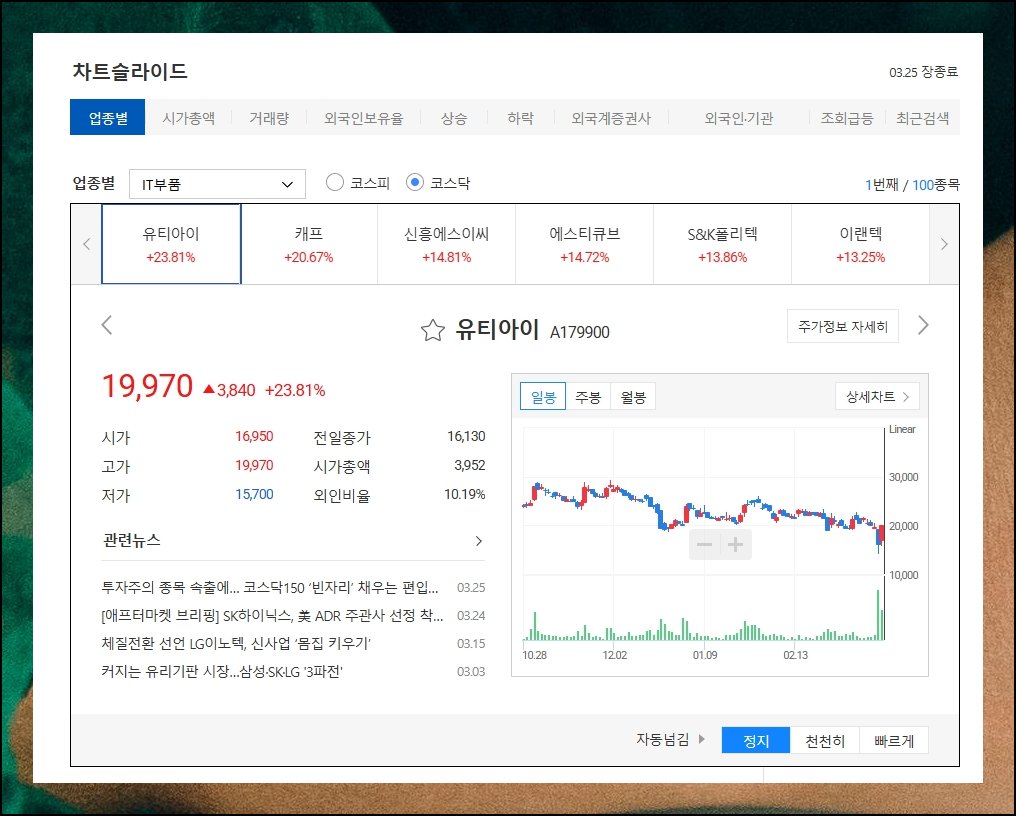 산업군 이름 옆 슬라이드 아이콘을 탭하면 그 섹터에 묶인 주식 종목들을 순차적으로 넘겨보실 수 있어요. 하루, 한 주, 한 달 단위 그래프와 함께 시초가, 최고가, 최저가, 해외 투자자 보유 비중 같은 주요 지표가 실시간으로 표출됩니다. 자동 전환 옵션도 갖춰져 있어서 동일 섹터 내 기업 간 움직임을 대조하기가 한결 편해요.