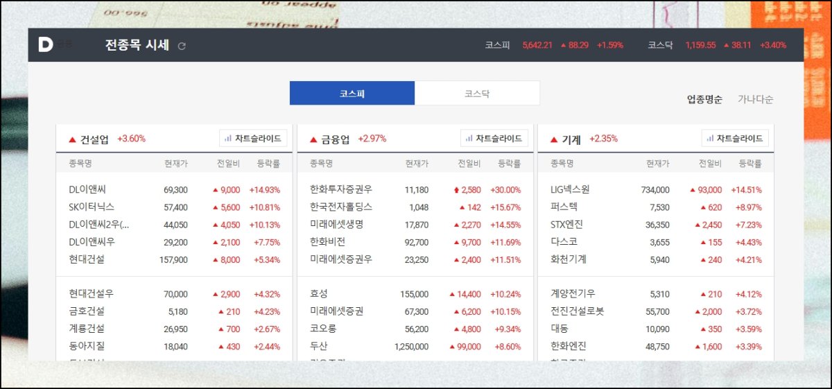 전종목 시세 페이지를 열면 산업군마다 구분된 보드가 나타나요. 상단에 건설, 금융, 기계 등 각 섹터의 오름내림 비율이 표시돼 있어 장 전체 온도를 재빠르게 가늠하실 수 있습니다. 개별 종목 이름 곁에는 실시간 거래 값과 어제 대비 차이가 쉴 새 없이 갱신되고 있어요.