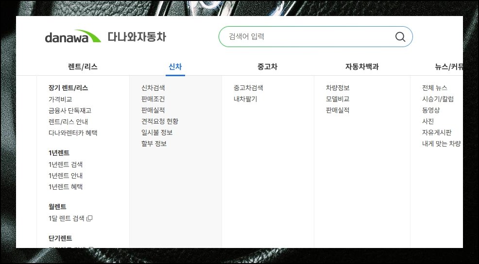 페이지에 접속한 뒤 상단의 신차 검색을 눌러 주세요. 이 플랫폼에는 렌탈, 리스, 중고 매물, 브랜드별 월간 출고량 등 풍부한 자료가 있습니다.