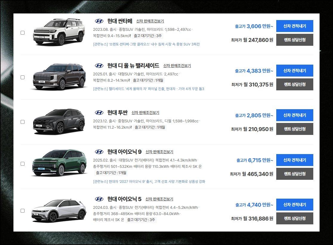 소형부터 대형까지 현대차가 내놓은 라인업은 꽤 다양한 편이고, 각 모델마다 성격이 뚜렷하게 다릅니다. 오늘은 현재 판매 중인 SUV 전 모델을 한눈에 정리하고, 종류별 판매조건과 세부 사양, 실제 구매 시 필요한 비용까지 꼼꼼하게 살펴보겠습니다. 견적 시스템을 활용하는 방법도 함께 안내해 드릴게요.