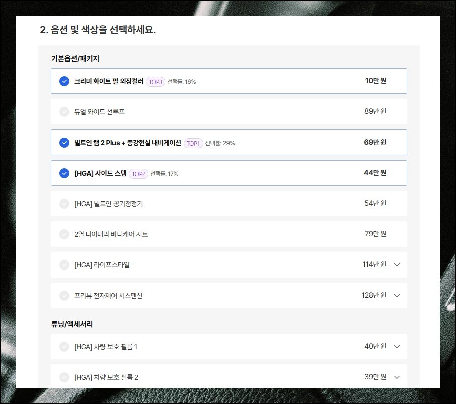 다음 구간에서는 추가 장비를 고릅니다. 출고 뒤에는 변경이 불가하니 충분히 비교하는 게 중요해요. SUV 종류 특성상 탑승자 편의 관련 항목을 우선 챙기면 만족도가 높습니다.