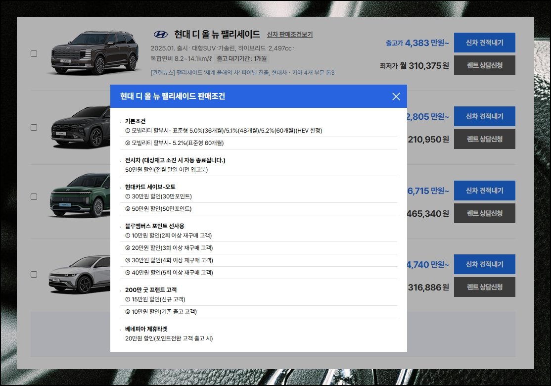 현대차가 그달에 내놓는 특별 혜택 목록이 펼쳐집니다. 친환경차 보조금이나 멤버십 포인트 활용으로 부담을 줄일 수 있어요. 이제 실제 지출액을 따져 볼 차례입니다. 리스트 우측 버튼을 누르면 웹 견적 도구로 넘어갑니다.
