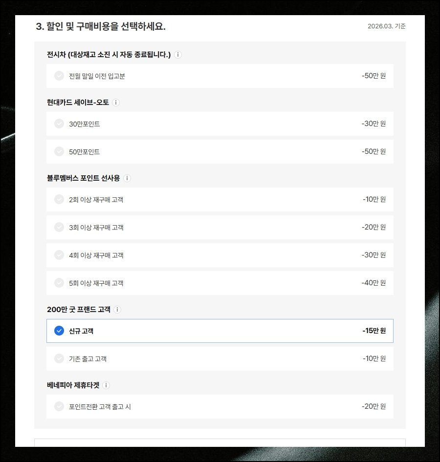 다음은 가격 인하 및 추가 경비 설정 구간이에요. 앞서 살펴둔 현대차 프로모션 가운데 본인에게 해당하는 걸 택하면 됩니다. 선택지가 넓으니 꼼꼼히 훑어보면 의외의 혜택이 숨어 있을 수 있습니다.