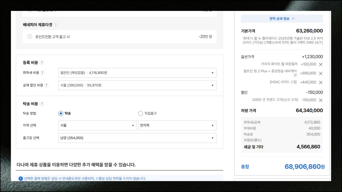 어떤 브랜드를 고르든 등록세, 공채 매입, 운송비는 피할 수 없는 지출 항목입니다. 이 액수도 합산에 반영돼요. 거주 권역과 인도 거점만 넣으면 시스템이 자동 계산합니다. 모든 입력을 마치면 화면 하단 우측에서 실질 납부 총액을 바로 볼 수 있습니다.