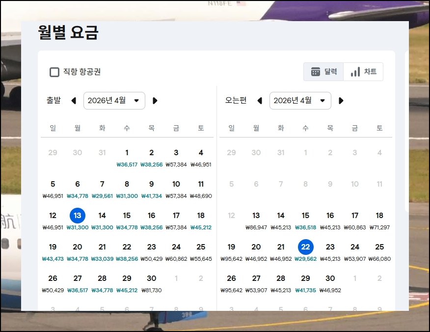 조회 기간을 30일 범위로 잡으면 캘린더 레이아웃으로 각 날짜별 운임이 표시돼요. 여수에서 출발하는 날과 제주에서 복귀하는 날을 각각 골라 주세요. 자신의 여행 일정과 가장 낮은 항공권 운임을 함께 고려하며 일자를 확정하는 편이 현명합니다.