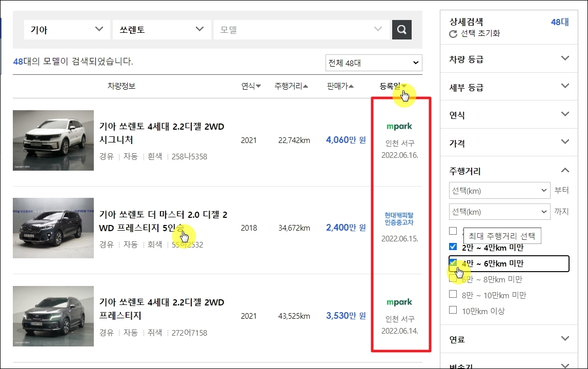 ▼등록일이 최신이면서 주행거리가 2만에서 4만 킬로 사이인 매물을 찾아보았습니다. 기아자동차의 쏘렌토가 눈에 띄네요. 주행거리가 34,672km로 매우 적게 운행된 편입니다. 연식도 2018년 정도로 많이 오래되지 않았고요. 차량 정보나 차량 이미지를 마우스로 클릭해 보겠습니다.