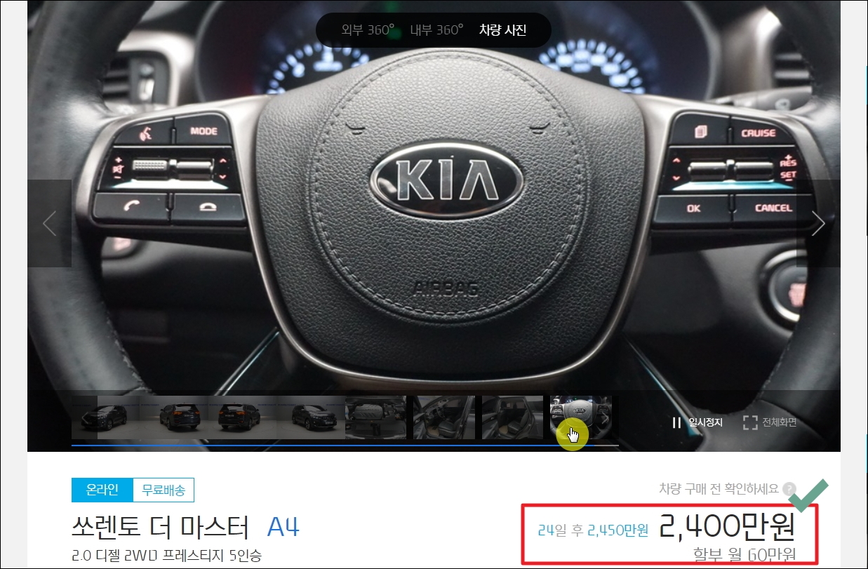 ▼상세 페이지가 열렸습니다. 온라인으로 구매가 가능하고, 무료로 배송을 해준다고 합니다. 차량의 내부와 외관에 대한 사진이 많으니 꼼꼼히 살펴볼 수 있습니다.