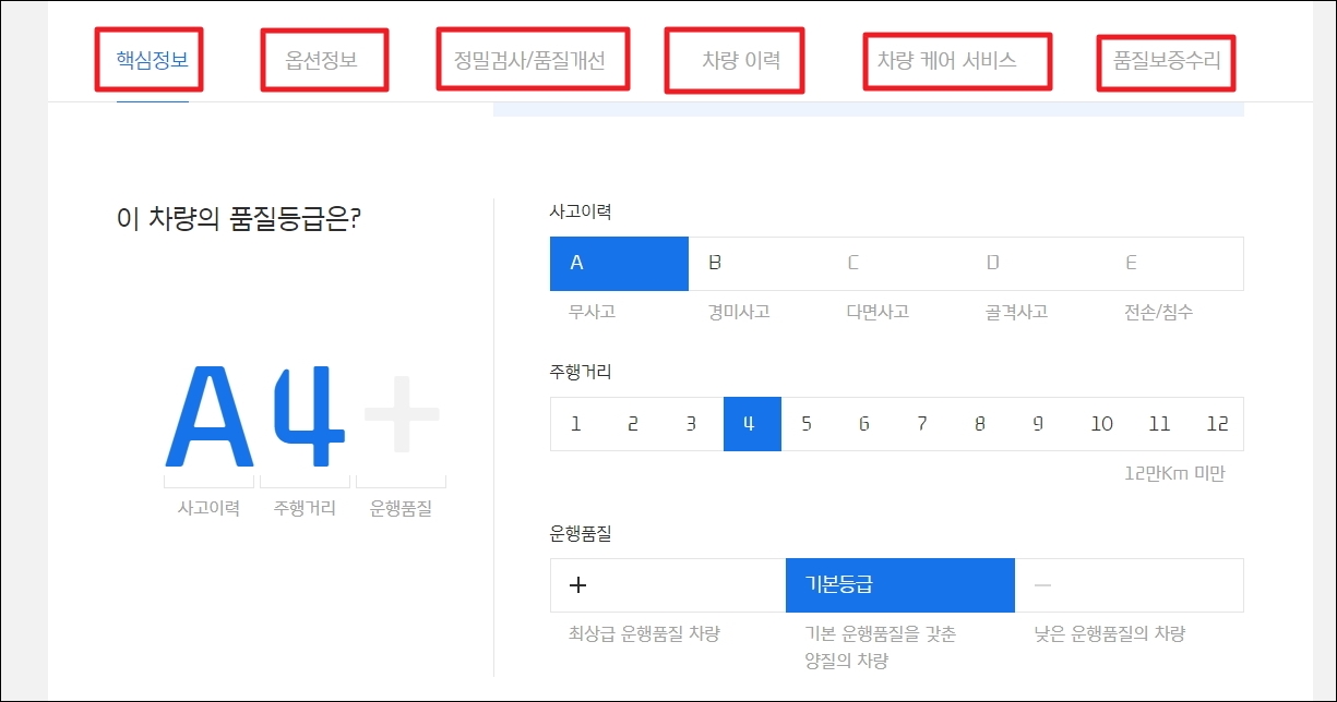 ▼사진 다음으로는 핵심 정보, 옵션 정보, 정밀 검사 및 품질개선 내용, 차량 이력 등 중고차 구매 시 필수적으로 알고 있어야 하는 정보를 거의 모두 제공하고 있습니다. 아무래도 사고 이력이 없는 무사고 차량이 좋습니다.