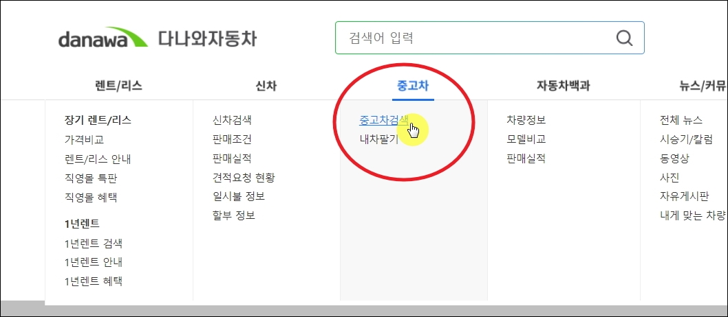 ▼다나와 자동차 홈페이지에서 메뉴를 보면 중고차 메뉴가 있습니다. [중고차 검색]을 마우스로 클릭해 주세요. 참고로 신차, 렌트, 리스 가격표도 이곳에서 살펴볼 수 있습니다.