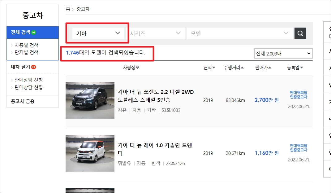 많은 매물을 통해 서로 비교해보거나 적정 수준의 시세를 파악하기 용이한 기아자동차 중고차가격표를 이용해 보겠습니다. 금일 기준으로 1,746대를 살펴볼 수 있었는데요. 가격표 보는 방법을 알려드릴테니 항상 최신으로 중고차 정보를 얻으시길 바랍니다. 기아 외에도 현대, 쉐보레, 르노삼성 등 여러 브랜드의 모델을 살펴볼 수 있습니다.