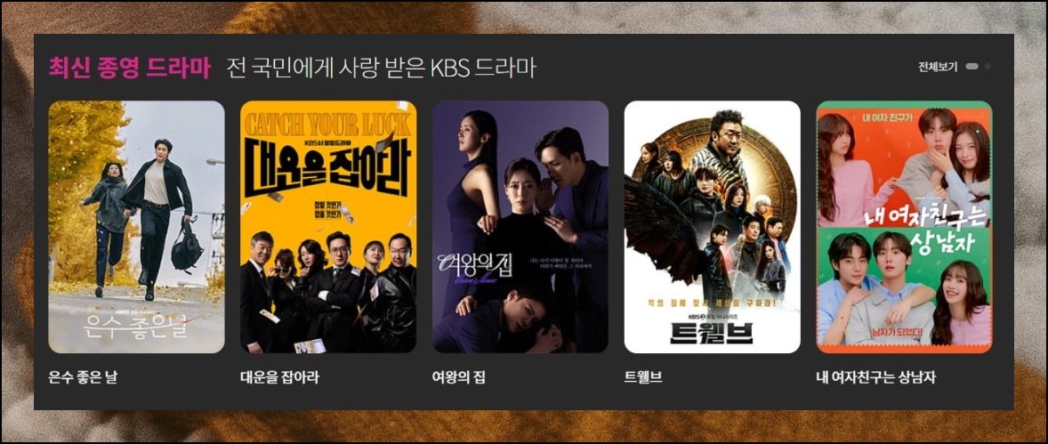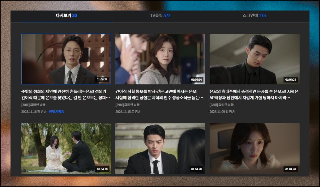 얼마 전 막을 내린 고려거란전쟁과 효심이네 각자도생도 다시보기로 올라와 있습니다. 환상연가나 우아한 제국 같은 드라마 역시 카탈로그에 자리잡고 있어요. 방대한 양의 영상이 무료로 공개되고 있으니 천천히 훑어보세요.