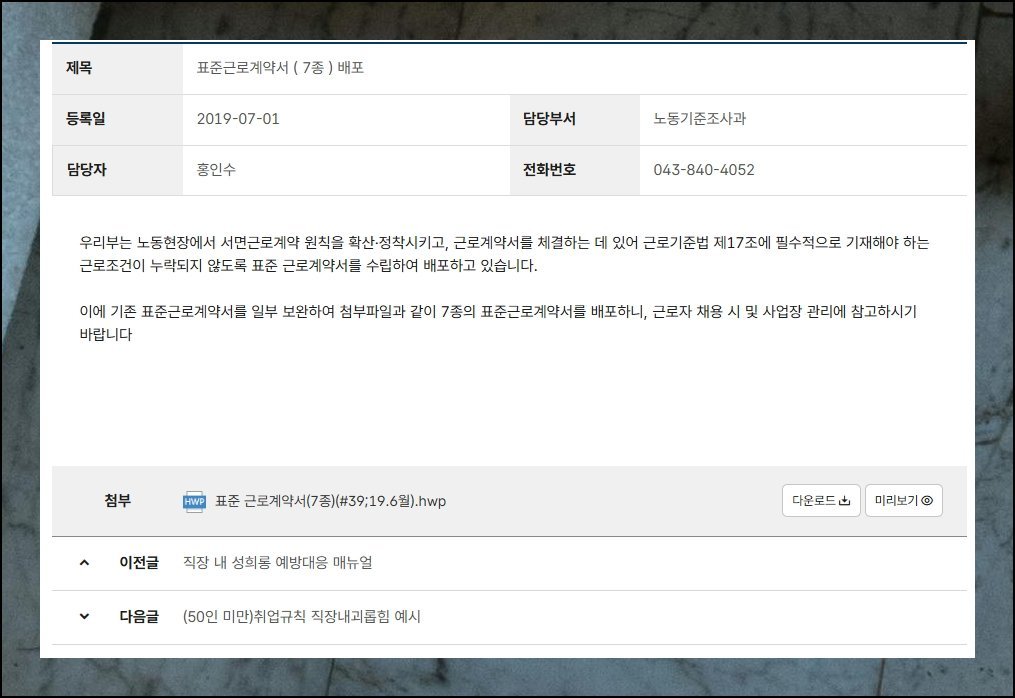 노동부 홈페이지로 들어간 뒤 화면 상단 검색 입력란을 쓰면 수월합니다. 표준 근로계약서라는 문구만 타이핑하면 충분해요. 연관 정보가 화면에 주르륵 표시될 거예요. 결과물 가운데 뉴스소식 카테고리를 골라 눌러봅니다. 그 메뉴 안에서 7가지 무료 서식이 담긴 알림글을 곧바로 마주하게 됩니다. 메뉴 구조가 직관적이라 처음 방문한 분이라도 헤매지 않고 원하는 항목을 찾아낼 거예요.