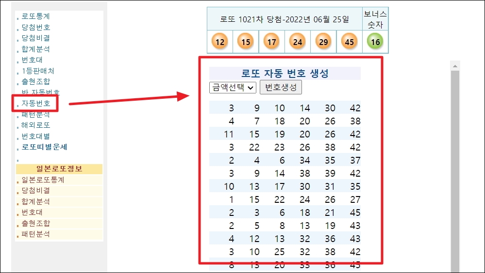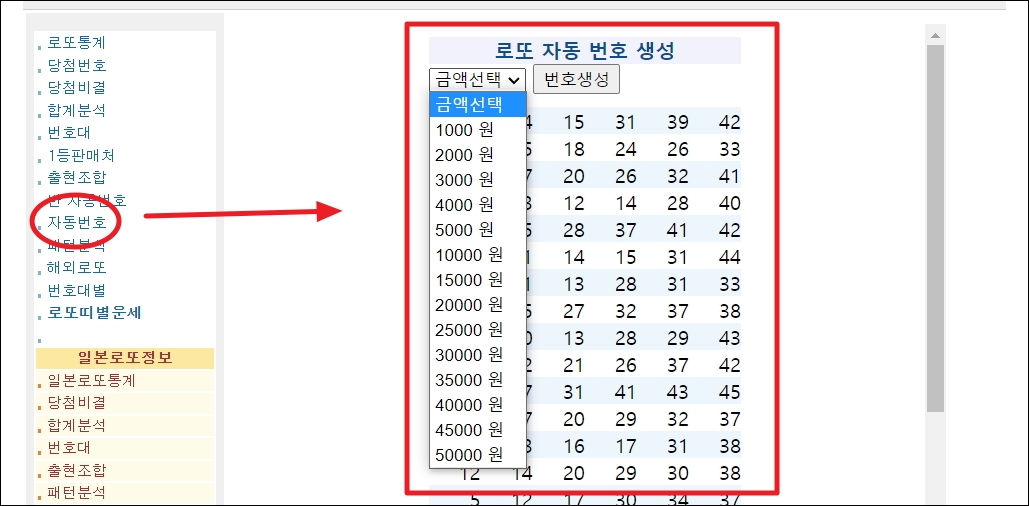 ▼새롭게 열린 페이지를 보면 우리가 찾고 있었던 로또 번호 생성기가 나타납니다. 좌측에 있는 메뉴에서 [자동 번호]를 선택하면 됩니다. 앞서 말씀드린 바와 같이 금액 선택 후에 [번호 생성] 버튼을 클릭하면 바로 사용이 가능합니다.