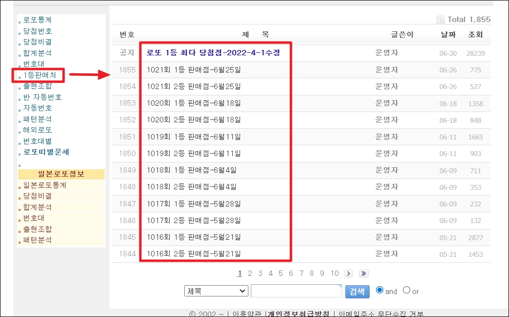 ▼이번에는 1회부터 지금까지 로또 1등을 배출한 판매처를 알아보는 방법을 알려 드리겠습니다. 생성기 프로그램과 함께 사용하면 좋은 기능입니다. 좌측에 있는 메뉴에서 1등 판매처를 클릭해 보세요. 그럼 회차별로 1등 및 2등 판매점 리스트가 나타납니다.