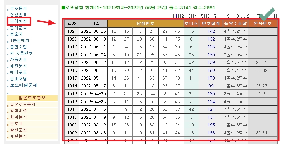 ▼마지막으로 각 회차에 대한 추첨일, 당첨 및 보너스 번호, 합계, 홀짝수 조합, 연속 번호를 한눈에 볼 수 있도록 표로 만들어야지 정보를 살펴보는 방법을 알려 드리겠습니다. 좌측에 있는 메뉴에서 당첨 비결을 선택하면 됩니다.