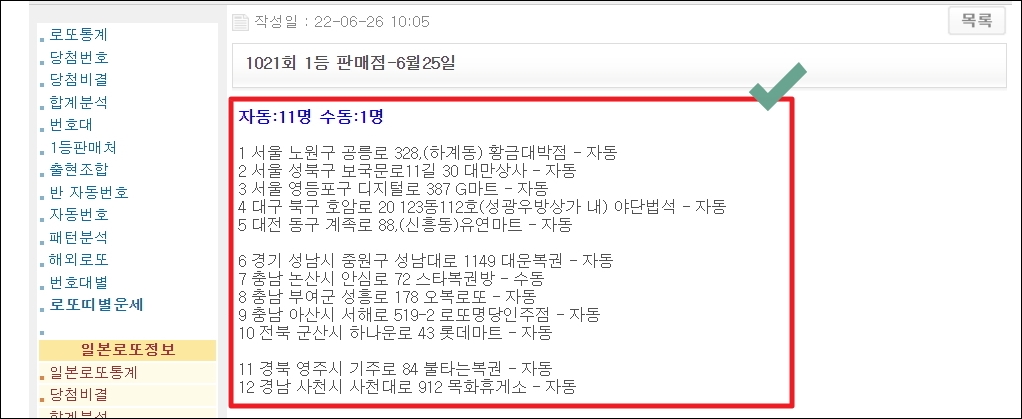 ▼저는 1021회 1등 판매점에 대한 게시물을 열어 보았습니다. 자동을 사용한 사람이 11명, 수동 방식을 사용하는 사람이 한 명 있네요. 각 로또 당첨자가 어느 판매점에서 구매한 것인지 자세한 주소가 나와 있습니다.