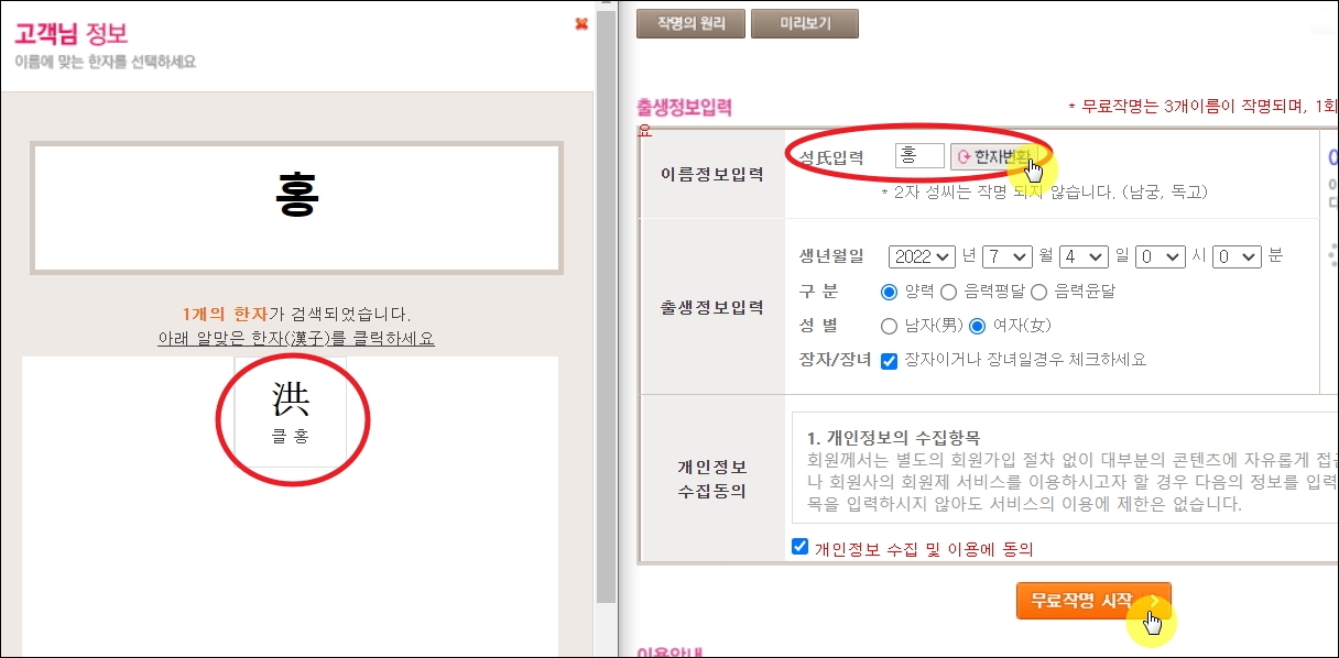 ▼무조건 예쁜 이름을 사용하는 것은 옳지 않습니다. 나에게 맞는 예쁜 이름을 사용해야죠. 그렇게 하기 위해서는 작명 서비스에서 요구하는 여자 아이의 성 씨와 출생 정보를 정확하게 입력해야 합니다. 이러한 정보를 바탕으로 사주에 좋거나 성명학에 근거하여 나에게 맞는 이름을 추천 받을 수 있습니다.