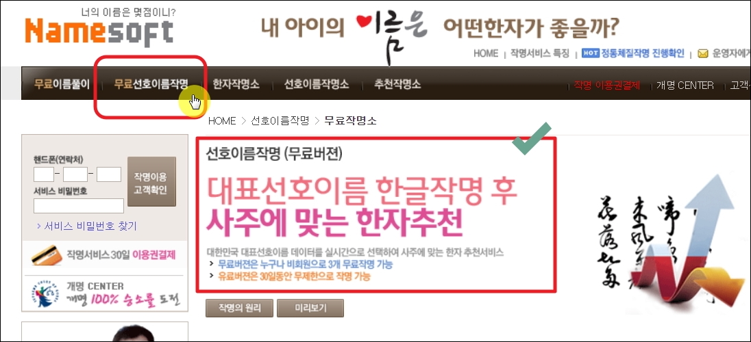 ▼작명 서비스를 무료로 이용하실 위해서는 메뉴에 있는 [무료 선호 이름 작명] 버튼을 클릭해 주세요. 사주에 맞는 한자까지 추천해 주기 때문에 제대로 된 작명을 하고 싶을 때에 매우 유용합니다.