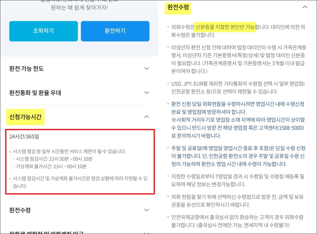 ▼시스템 점검 시간을 제외한 365일 하루 24시간 동안 언제든 이용이 가능합니다. 시시각각 변하는 환율 정보를 보고, 매매하는 용도로 사용할 수도 있어요. 물론 환율 예측은 정말 어려운 일입니다. 환전 이후에 현찰로 수령을 하는 것도 가능합니다. 신분증을 들고 해당 외화를 보유하고 있는 지점을 방문하면 돼요.