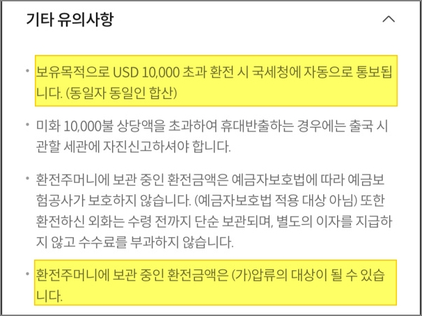 보유 목적으로 일정 금액을 환전할 때에는 국세청에 자동으로 통보가 되는데요. 문제가 없는 경우라면 걱정할 필요는 전혀 없습니다. 그리고 주머니에 보관 중인 금액은 (가)압류의 대상이 될 수 있으니 이 부분도 참고해 주세요.