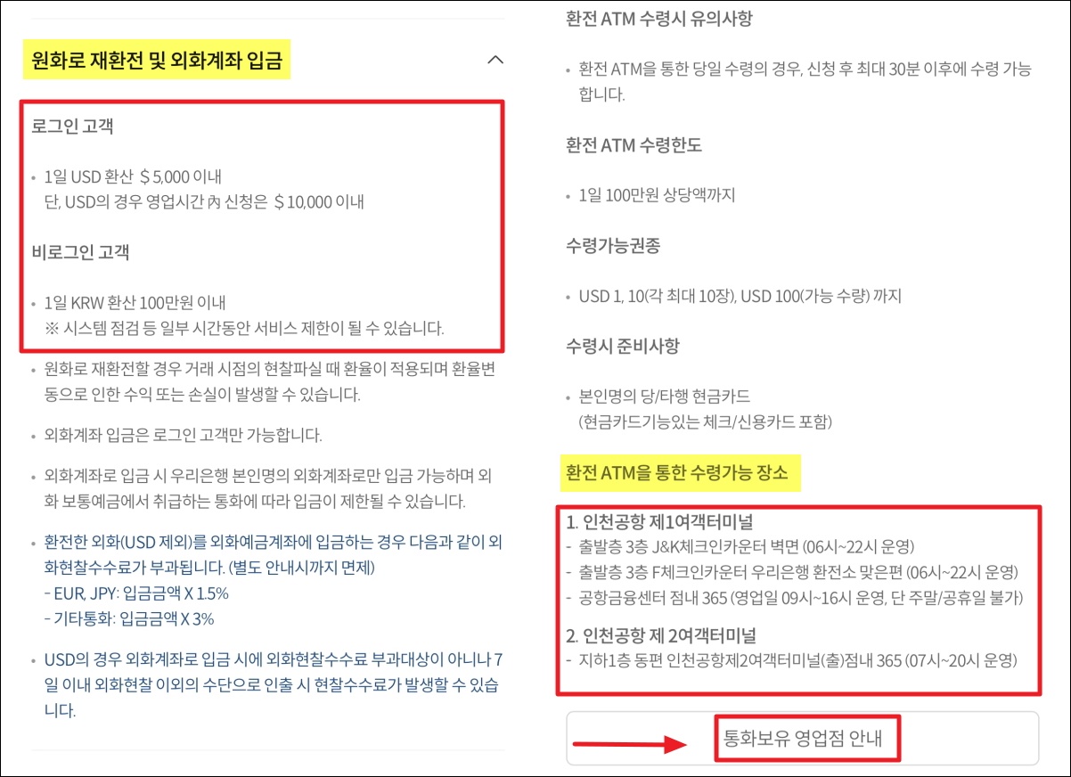 ▼원화에서 달러로 환전을 한 다음에 나중에 다시 원화로 재환전을 할 수도 있습니다. 전용 ATM 기기를 통해 현찰로 받는 것도 가능하고요. 앞서 언급한 바와 같이 통화보유 영업점에 신분증을 가지고 가면 외화 수령이 가능합니다.