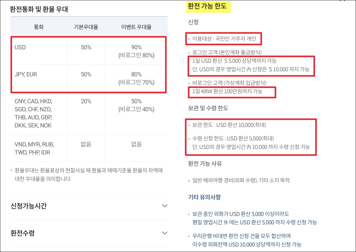 ▼서비스를 이용하는 방법은 위와 같이 단순합니다. 여기에 더하여 해당 서비스를 이용할 때 도움이 되는 안내 문구를 몇 가지 살펴보겠습니다. 일단 USD의 경우에는 10% 수준으로 수수료를 싸게 진행하는 것이 가능하고요. 엔화와 유로화의 경우 80%까지 우대 받아 환전을 할 수 있습니다. 우리나라 국민이라면 누구나 이용이 가능하지만, 보관 및 수령 한도가 정해져 있습니다.