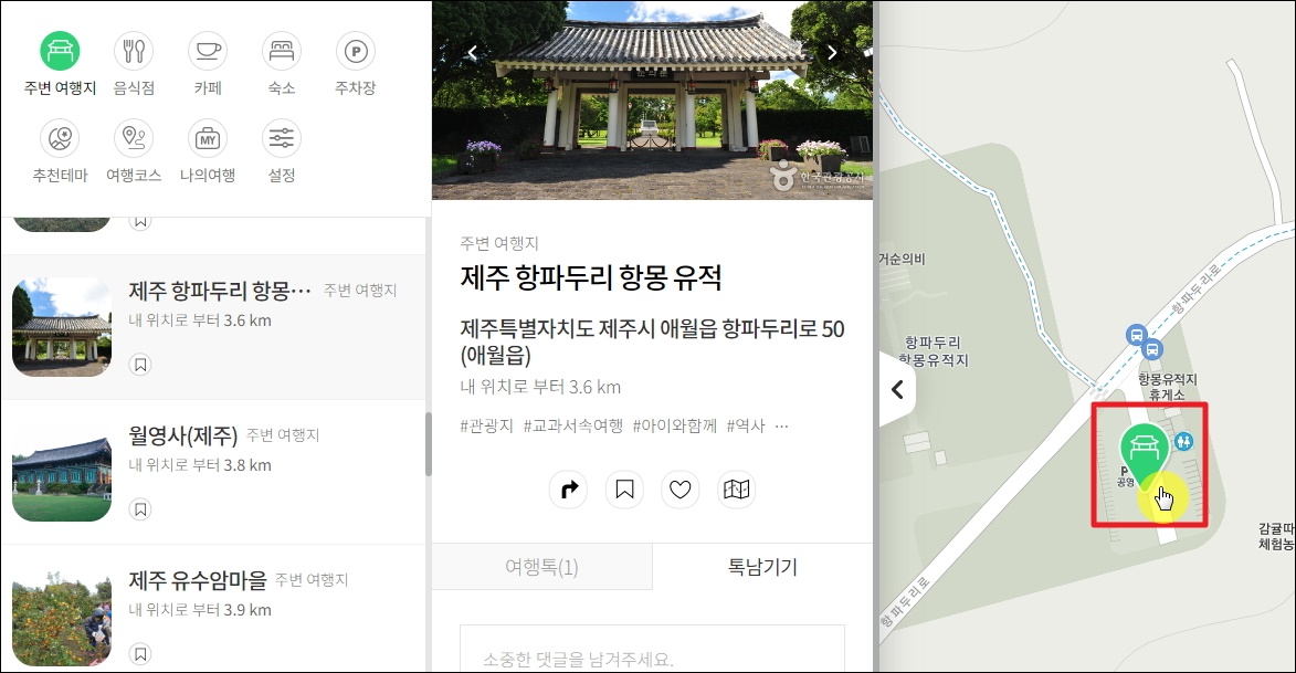 ▼다음은 제가 이용하는 여행지도 서비스를 이용하여 제주 항파두리 항몽 유적을 찾아본 결과입니다. 다양한 사진과 관광지의 주소는 물론이고, 현재 내 위치에서 얼마나 멀리 떨어져 있는지 알 수 있습니다. 여행톡과 같은 후기 서비스를 통해 다른 사람들이 어떤 좋은 경험을 했는지도 알아볼 수 있습니다. 상세한 정보도 추가로 볼 수 있어요.