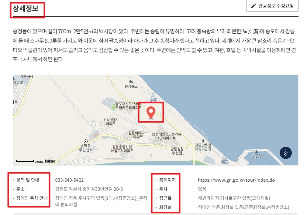 ▼상세정보란에서는 우리가 찾은 송정해변 관광지에 대한 내용을 살펴볼 수 있습니다. 그 다음으로는 문의 및 안내처, 주소, 주차, 접근로, 화장실, 홈페이지 등 알고 있으면 도움이 되는 정보가 표시됩니다.