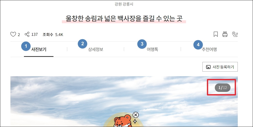 ▼이전 단계에서 사진 부분을 클릭하면 다음과 같은 상세 페이지가 열립니다. 우리가 여행지도에서 찾은 관광지에 대한 정보를 많이 볼 수 있는 곳이죠. 송정해변에 관련된 사진이 12개나 올라와 있음을 알 수 있습니다.