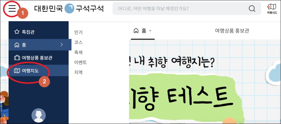 ▼대한민국 구석구석 사이트에 접속했습니다. 좌측 상단에 있는 메뉴를 클릭해 보세요. 그럼 여러 가지 여행 관련 서비스가 나타납니다. 관광코스를 추천 받거나 인기 있는 관광지에 대한 정보를 많이 얻을 수 있죠. 이번에 이용해볼 서비스는 [여행지도] 입니다.
